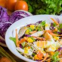 Mixed greens, chicken, grains, granola, apple, carrots, yellow bell pepper, cheese, egg tomato, mango, tossed in mango vinaigrette