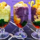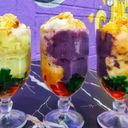 Buco Pandan Creamed flavored milk (no ice cream) Toppings: Almonds, Pinipig, leche flan, cheese, cornflakes Ingredients: Pure Creamy Ube, cinnamon banana, Mong Beans, yema, sweet mango, nata de coco, fresh macapuno, sweet whole corn, purple and yellow jellies.