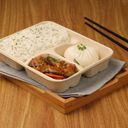 Tenderloin beef tossed in a Mongolian sauce topped in steaming hot rice together with corn kernels and vegetables on top of white rice