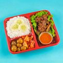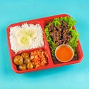 For reference: A delicious Korean-inspired bento meal featuring tender beef samgyupsal, paired with rice and traditional side dishes.