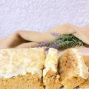 Two slices of our perfectly-spiced, super moist Carrot Loaf with real grated Carrots topped with our signature Cream Cheese frosting drizzled with sliced Almonds.