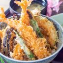 For reference: Tempuradon, a rice dish topped with tempura, combining crispy fried vegetables and shrimp with warm rice.