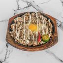 Deep fried pork belly ears & chicken liver topped with chili, onions & egg served on a sizzling plate & option to be served with mayonnaise on top.