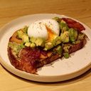 A Slice of toasted Sourdough with Guacamole, Bacon, diced Avocadoes and a soft boiled egg on top.