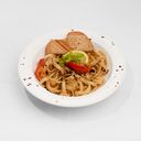 For reference: Savory pasta dish featuring chicken meatballs in a rich tomato and basil sauce.