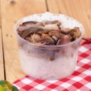 For reference: Crispy roasted beef served with rice and flavorful dipping sauce.