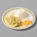 For reference: A pasta dish made with chicken and corn, topped with rich pesto sauce for added flavor.