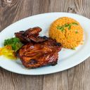 For reference only: Grilled chicken BBQ served with Java rice, a Filipino-style garlic fried rice flavored with soy sauce.