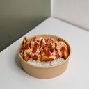 -BEST SELLER - Rice topped with fried chicken tenders, homemade marinara sauce, cheese sauce and parmesan cheese