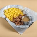 For reference: Grilled marinated meat served with flavorful rice, topped with a creamy sauce and vegetables.