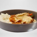 Breaded chicken breast in creamy sauce served over rice.