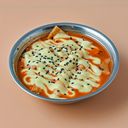 Korean chewy rice cakes and fish cake cooked in spicy based sauce with Cheese Sauce toppings