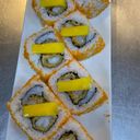 cooked shrimp,tempura flakes spicy mayo topped with slices of mango