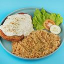 Juicy chicken smothered in red sauce, covered in melted cheese, and served with a side of mild spicy rice
