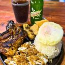 Inasal chicken with pork sisig combo + Sweet Banana + tempura Cruckers + gumalan + mountaindew + egg