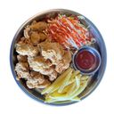 250g. Deep fried boneless chicken coated with korean yangyum sauce serves with potato fries and shredded vegetables.
