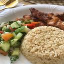 Juicy chicken skewers with fresh veggie salad & buttery rice