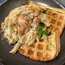 For reference: Crispy waffles topped with sweet maple syrup and creamy vanilla ice cream.