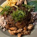 Rice noodles stir fried in a tangy, savory and sweet tamarind based sauce with egg,bean sprouts and scallions. Served with crushed peanuts and a fresh lime wedge.