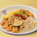 Stir-fry rice noodles cooked in special Pad Thai sauce with shrimps, scrambled egg, roasted peanuts, tofu, bean sprouts, spring onions and chili flakes