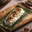 Sticky rice wrapped in banana leaf, topped with savory, spiced meat floss and a rich, aromatic paste that melts into every bite. Fragrant, satisfying, and packed with bold flavor—perfect for a quick indulgence or a comforting meal on the go. Try it today!
