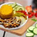 100% Beef shawarma and java rice mix with veggies cucumber tomato white onion and special sauces cheese garlic mayo and hot sauce