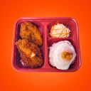 2 piece chicken in honey sriracha sauce with 1 cup of rice, sunny side up egg, and coleslaw as side dish.