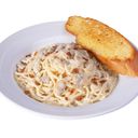 Spaghetti tossed with special creamy white sauce, chicken chunks, mushroom, topped with parmesan cheese and bacon bits