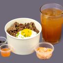 A bold twist on sisig. Served with rice and egg and a refreshing 12 oz juice.
