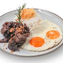 Thinly sliced Beef, Caramelised Onions and a sliced of Boiled Egg