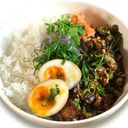 Braised chicken thigh with soy sauce, cane vinegar, bay leaf, coconut milk and a jammy soft boiled egg