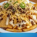 Overload fries and crispy nacho chips topped with lots of cheese sauce, ground meat and garlic sauce