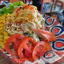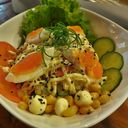 For reference only: Salad made with crab sticks (kani), mango slices, and mixed greens, typically served with a tangy dressing.