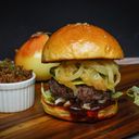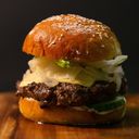 For reference: Juicy grilled beef patty topped with smoky sauce, cheese, and fresh toppings on a bun.