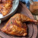 For reference: Crispy fried chicken quarter, golden brown, juicy inside, served with a side of sauce.
