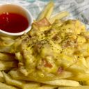 Crinkle cut fries with melted cheese on top and chicken tenders