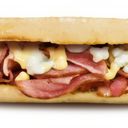 Beer Ham and Canadian Bacon has shreds of Canadian Bacon and Beer Ham Slices with Cheddar Cheese Sauce, Balsamic Mayo, and Mozzarella Cheese, sandwiched in perfectly toasted Pizza Bun.