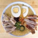 For reference: Savory rice porridge topped with crispy meat and a boiled egg, served hot.