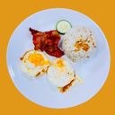 Crispy bacon served with garlic fried rice and sunny-side-up eggs