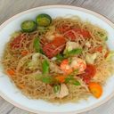 The pancit looks inviting but disappoints in flavor the noodles lack depth, and the sauce is too watery to tie the dish together.