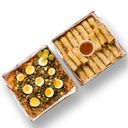 For reference: A large platter featuring savory noodles and crispy meat rolls, perfect for gatherings.