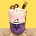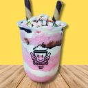 The classic pink ice scramble, levelled up. Topped with generous amount of skimmed milk, colorful marshmallows and sprinkles. With chocolate syrup, stick-o and pretzel.