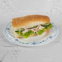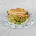 A sandwich consisting of bread, sliced cooked poultry, & vegetables.