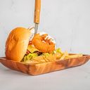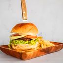 For reference: Juicy burger enveloped in crispy, savory strips, delivering a rich and indulgent flavor experience.