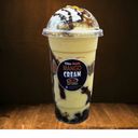 Fresh natural buco shake with buco strips, leche flan, whipped cream, caramel syrup toppings & black pearls