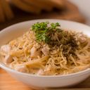 Creamy white pasta sauce with tender slices of chicken meat, mushroom parmesan cheese