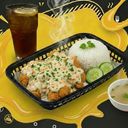 Chicken chunks tossed in our signature rich, cream sauce. Served over hot steamed rice, this meal comes complete with a side of warm, soup and a refreshing 16oz drink of your choice.