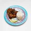 For reference: Three pieces of sweet, crispy chicken served with rice and flavorful, saucy wings.