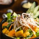 For reference only: A refreshing mix of crab sticks, fresh greens, ripe mango, and creamy mayo dressing.