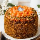 Carrot cheesecake filling enclosed in a moist carrot cake base, topped with cream frosting, roasted walnuts and toasted pumpkin seeds.